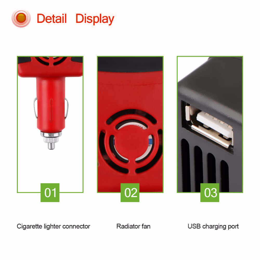 - Built-in cooling fan, auto-shutdown to keep your appliance and car from short circuit, low voltage and over voltage.
