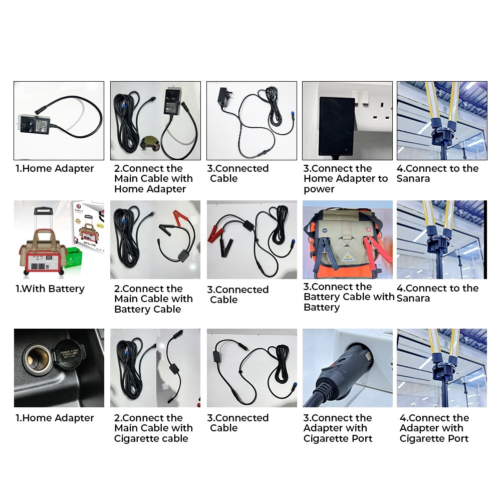 Camping Light Cable + Charging Adapter + Cigrate Lighter Adapter + Battery Clamps