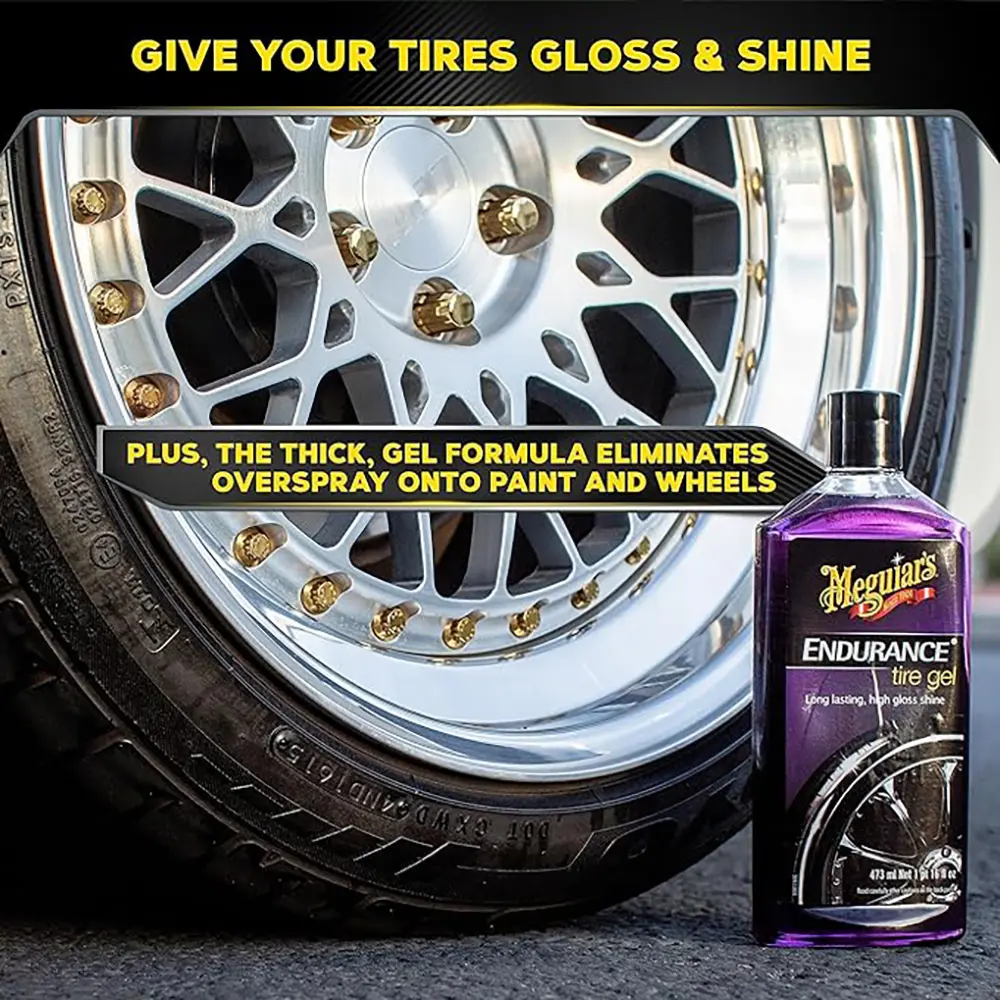 - PROTECTS AND SHINES TIRES: One 16 oz bottle of Meguiar’s Endurance Tire Gel and tire dressing with advanced macropolymers and copolymers that endure through washing and rain for a high-gloss car tire shine that lasts for weeks