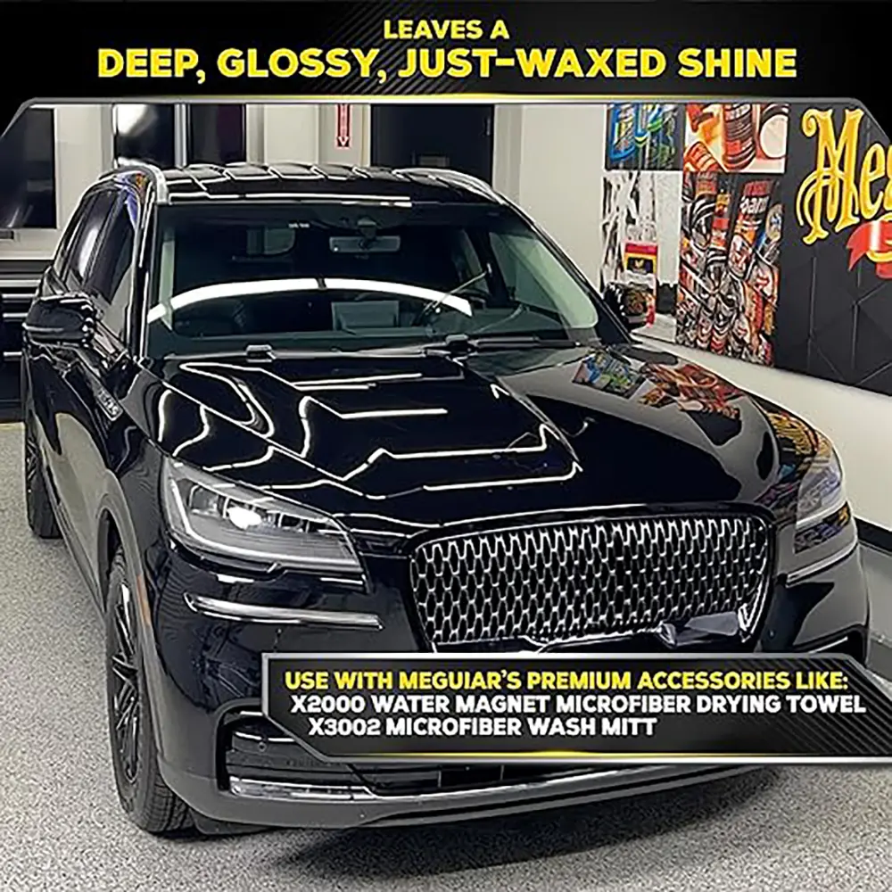 - Meguiar’s Ultimate Wash & Wax is a premium car wash soap that will gently clean your paint, leaving a deep, glossy shine while offering additional wax protection each time it’s used.