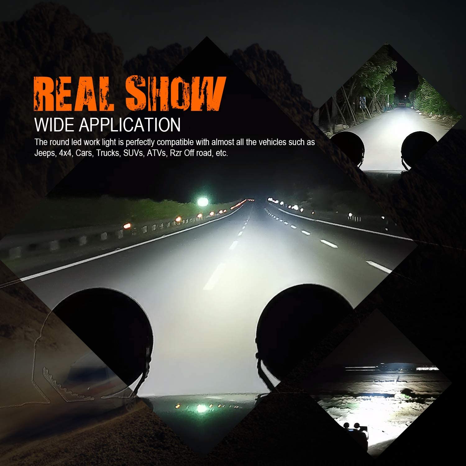 - The round led work light is perfectly compatible with almost all the vehicles such as Jeep, 4×4, Car, Trucks, SUVs, ATVs, Rzr Off-road, etc.