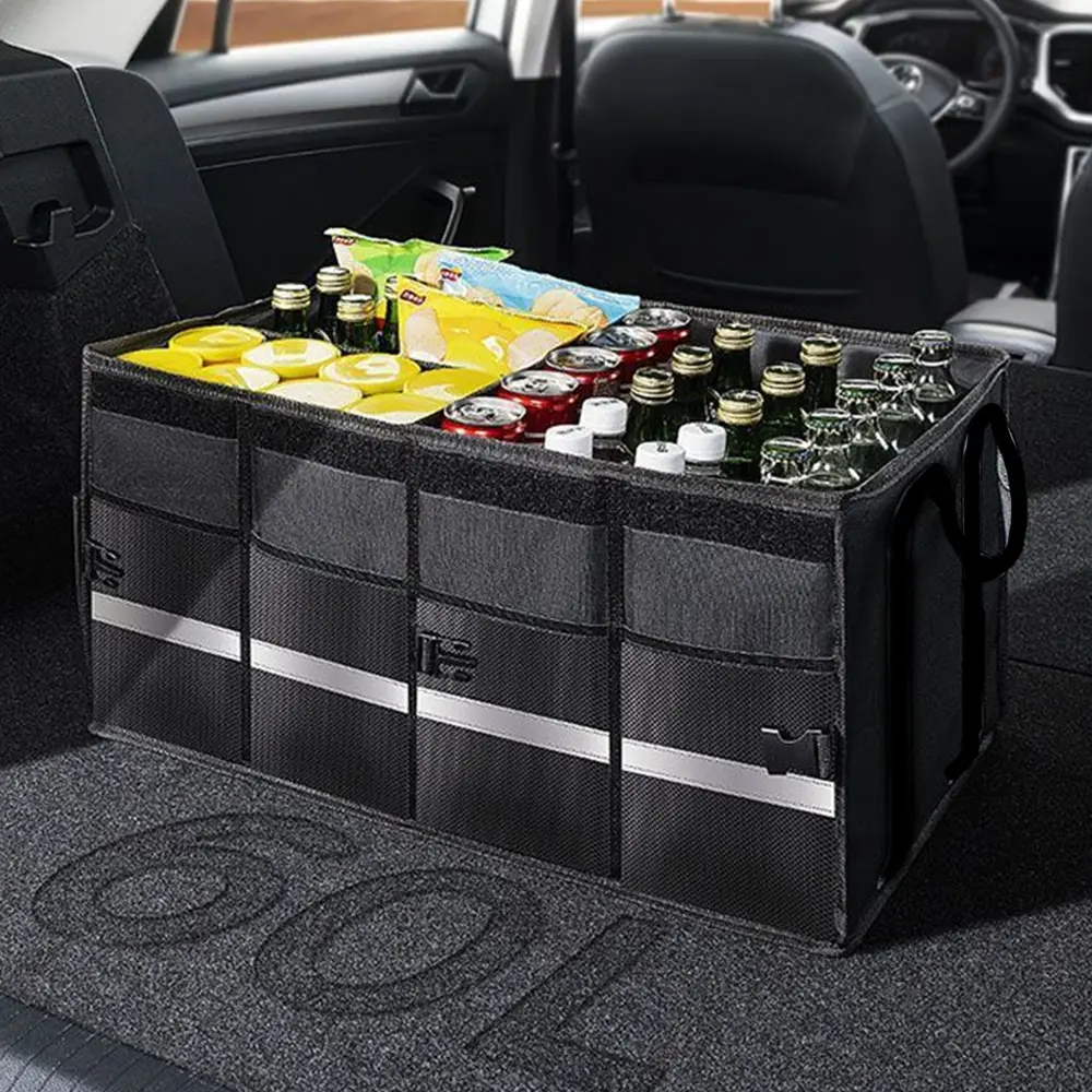 - 【Smart Trunk Organizer】 With reflective stripe makes this organizer more secure when you are carrying it at night. Two securing straps available non-slip waterproof bottom and Velcro make the storage organizer stay in place in the car. A good choice for carrying and organizing tools, toys, foods, sporting goods and so on.