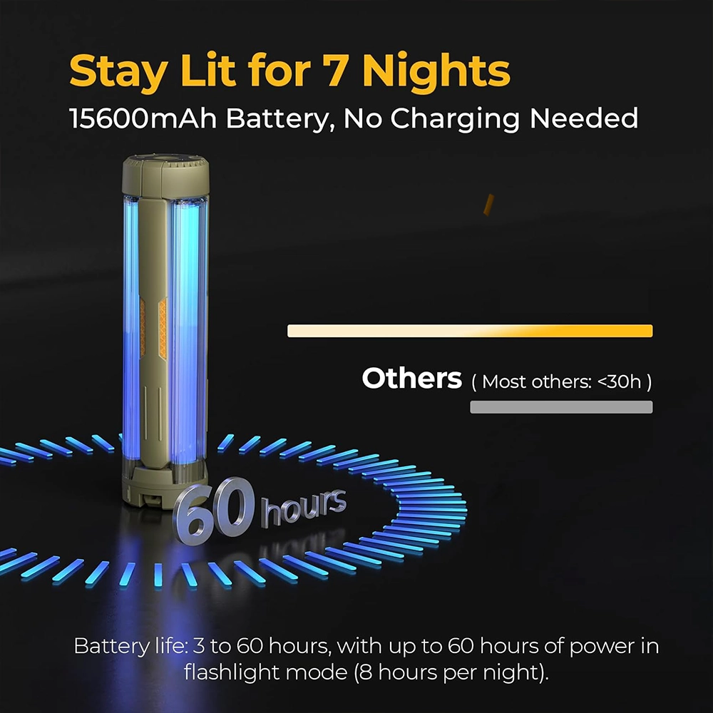 - Powered by a high-capacity 15600mAh rechargeable battery, the CPL-S01 provides exceptional runtime ranging from 3 to 60 hours, ensuring reliable lighting during long camping trips or outdoor activities. In flashlight mode, the light can last up to 60 hours, making it ideal for multi-day adventures without needing frequent charging.
