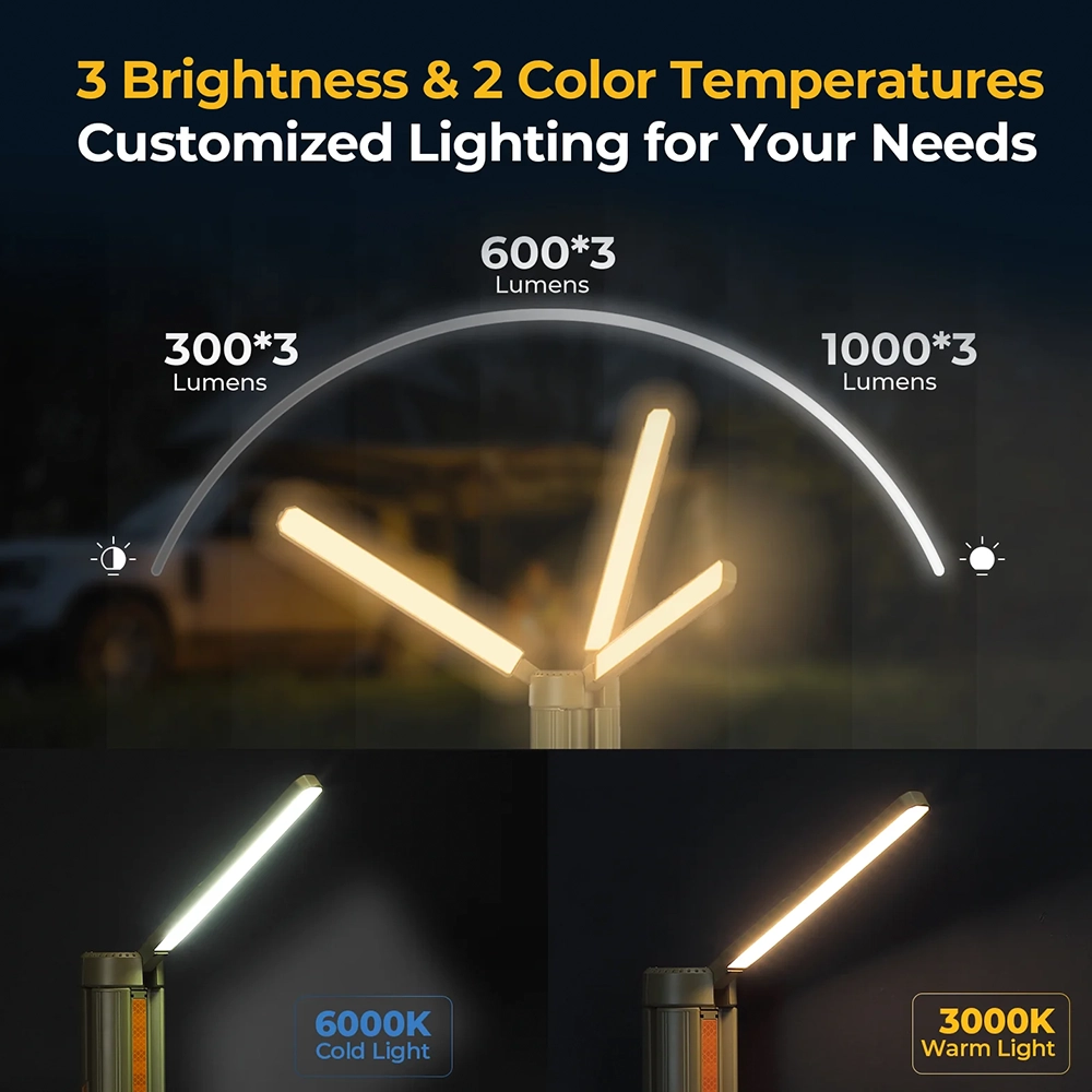 - The light features three brightness levels and two-color temperature options, allowing users to switch between warm ambient lighting (3000K) and bright white illumination (6000K) depending on the situation. This flexibility makes it suitable for relaxation, cooking, working, or emergency use.
