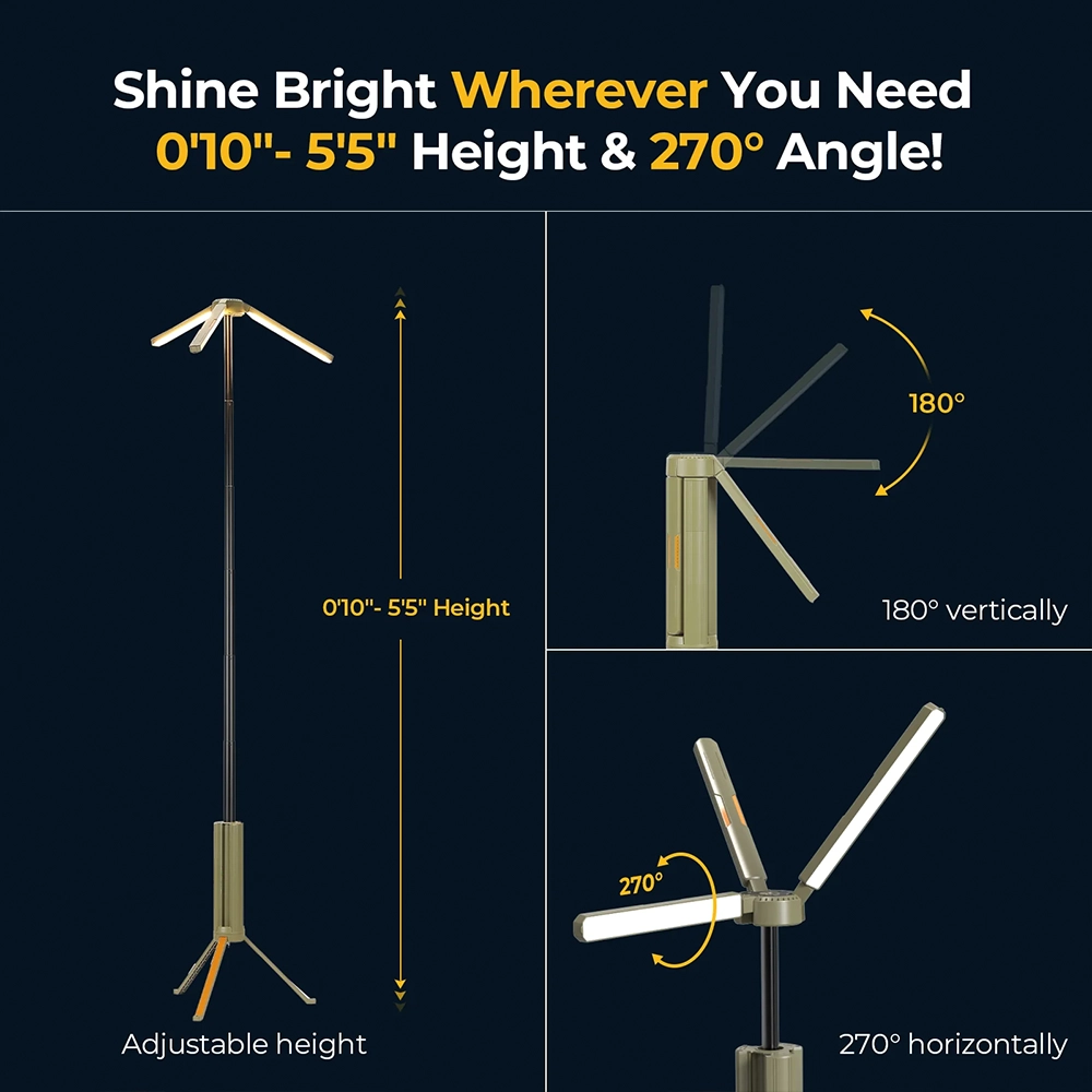 - Its adjustable height ranging from 0.10 ft to 5.5 ft allows the lantern to function as a full standing lamp, providing wide coverage for outdoor environments. The 270° adjustable lighting panels allow users to direct light exactly where it is needed.