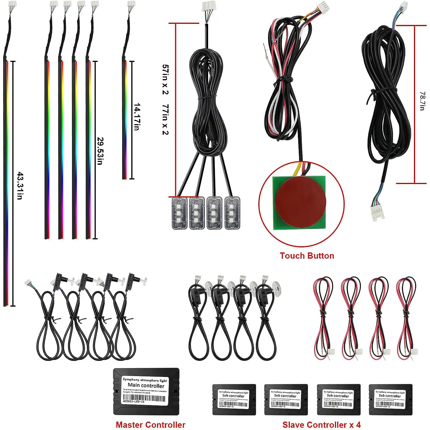 - This interior car LED light consists of 6 acrylic fiber optic light strips(175-inch 593 LED lights) , and has one master controller and 4 slave controller, which can be flexibly installed in any car without clutter.