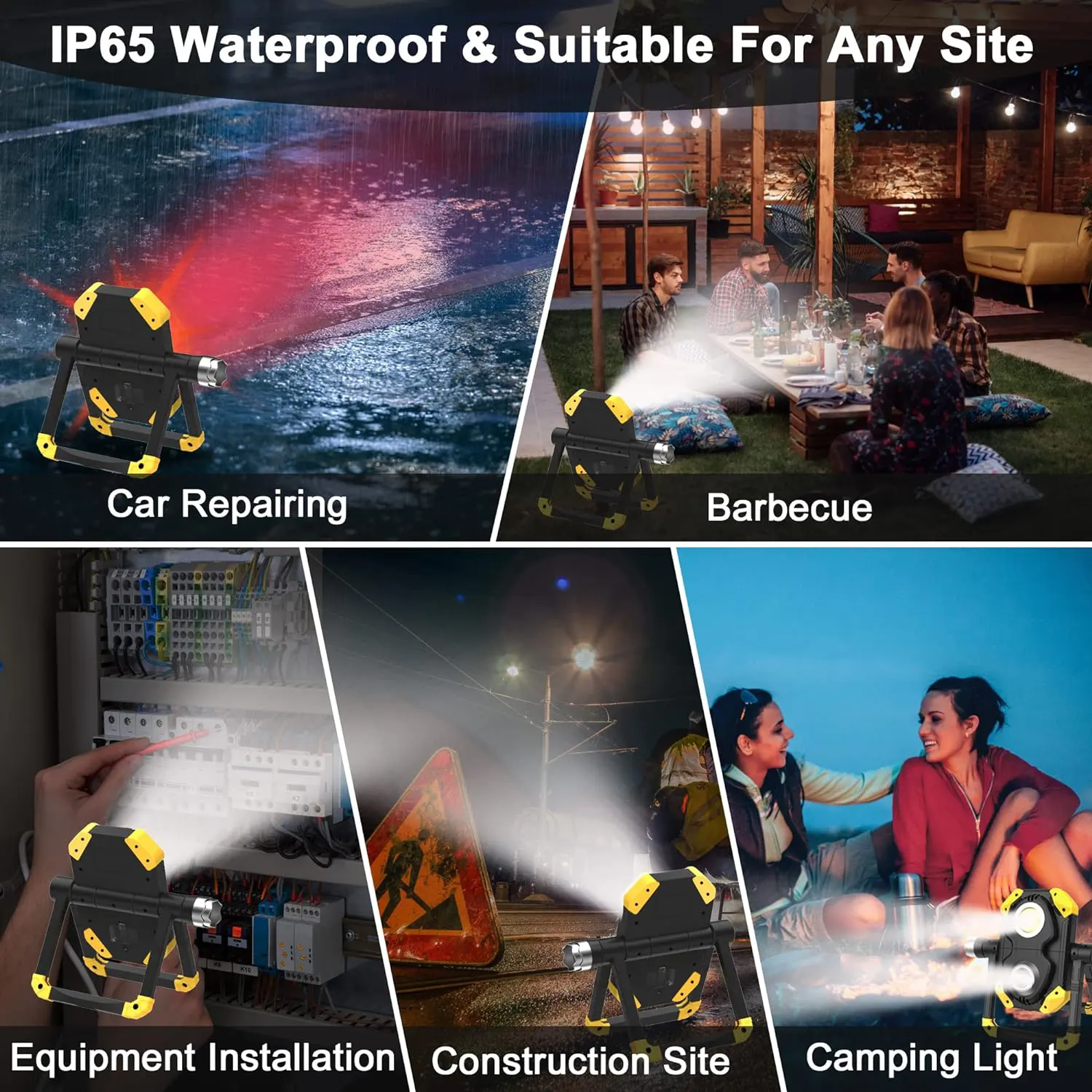 - Large Capacity Rechargeable Battery & Power Bank: With a 4400mAh rechargeable lithium battery, our led rechargeable work light provides 5 lighting modes: High light, 2 spotlights, flood light, and output with a red hazard feature.