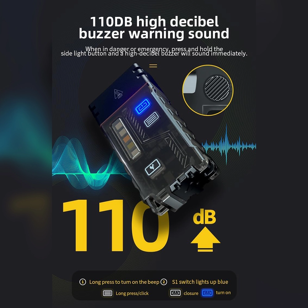 - When you encounter danger or emergency, long press the side light button or the warning sound will sound immediately. At the same time, the mini flashlight also has double arc ignition technology with intelligent discharge protection, which will automatically cut off in 5 seconds to avoid the risk of fire and burns.