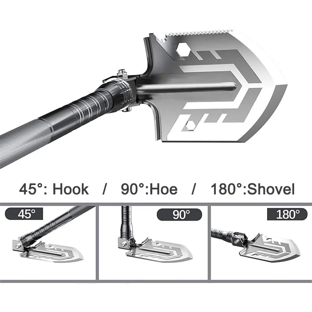 - Multifunctional tactical shovel with 45°/90°/180° adjustable angles.