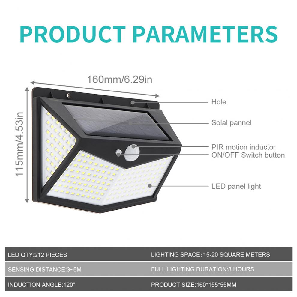- 212LED induction lights use the latest version of solar panels to withstand the sun’s energy during the day. The built-in rechargeable 18650 stores the power of the LED lights at night. Make full use of solar energy, electricity fee.