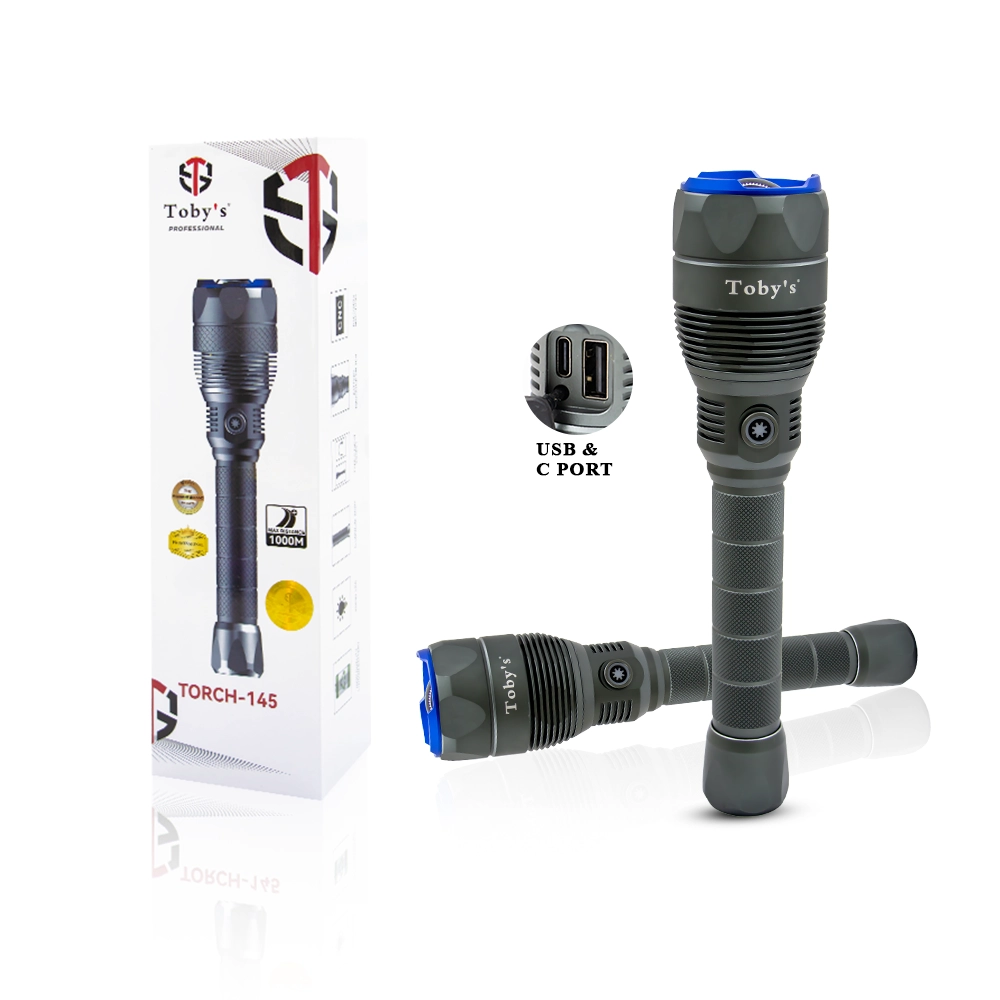 Toby’s Torch-145 Rechargeable LED Flashlight with Great Lumen Bright Powerful Torch Light – High Strength Aluminum Alloy – Long Lasting Battery Life