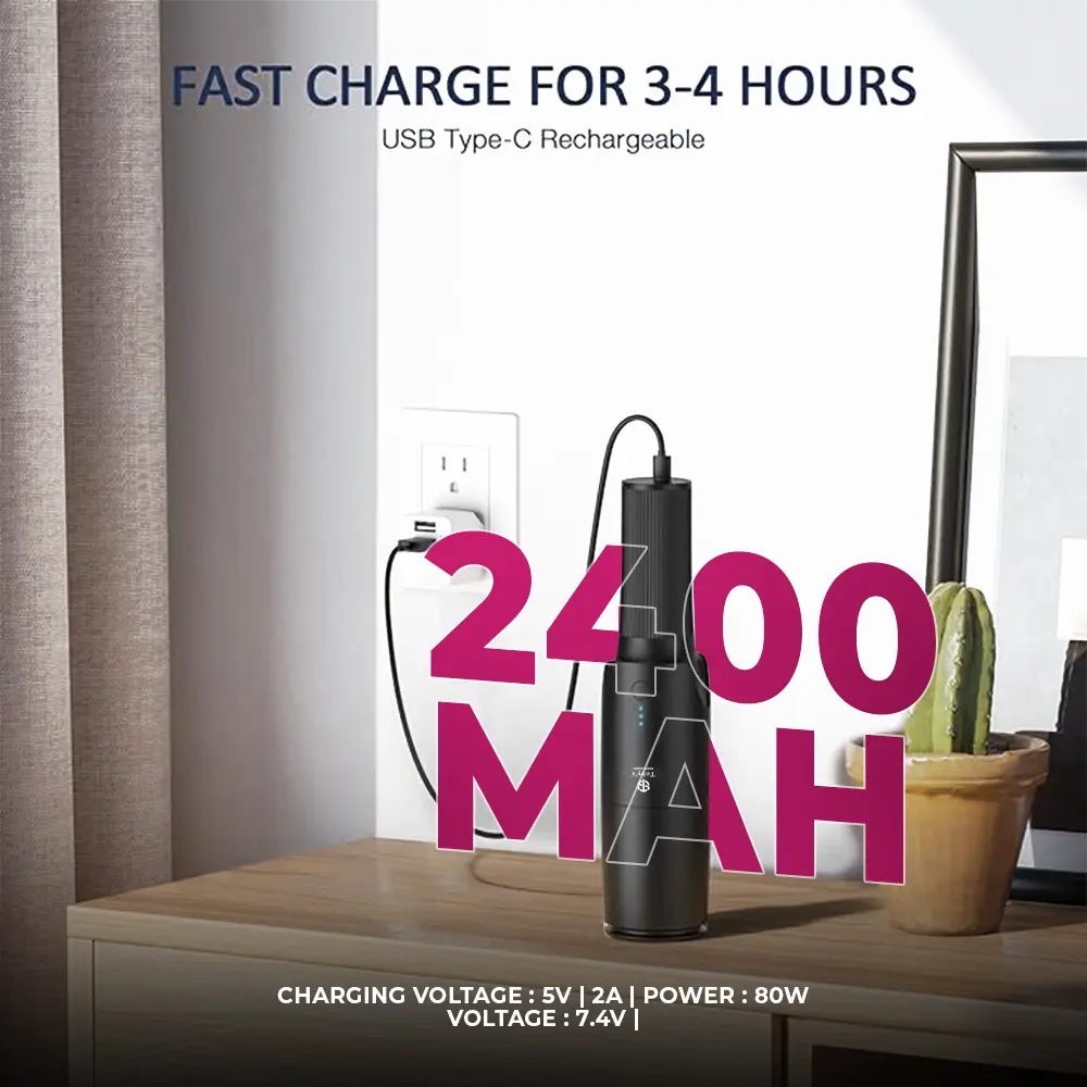 - USB Charging With fast charging technology and a reliable lithium battery, the mini vacuum takes only 3-4 hours to fully charge and can work for 25-30 minutes.