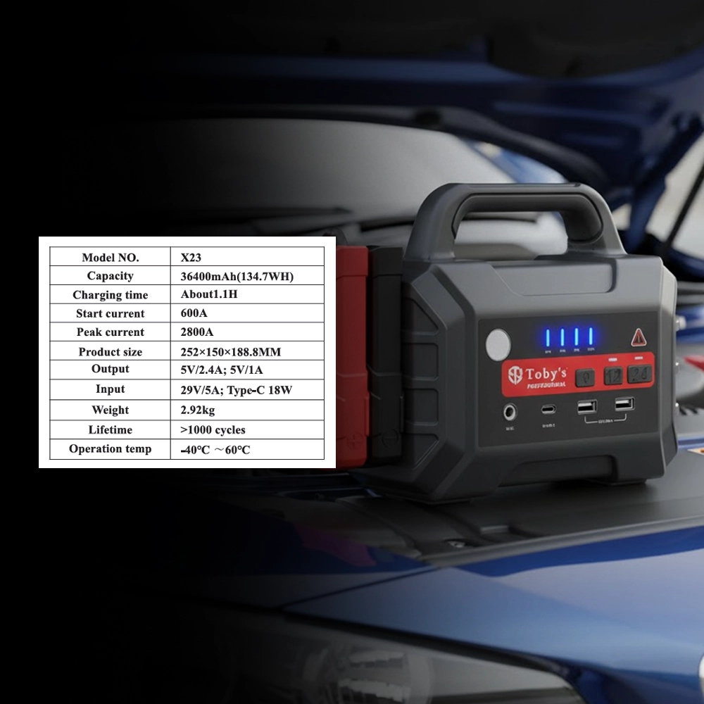 Equipped with a massive 36400mAh (134.7Wh) lithium battery, the Toby’s X23 provides strong and stable power output to jump start large petrol and diesel engines with confidence. - 2800A Peak Current Performance
